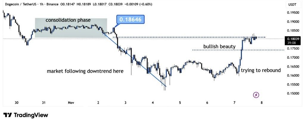 On the 1-hour chart, you can see how the market drifted lower into early November. But then bulls stepped in hard, pushing the DOGE price back toward $0.18–$0.185.
