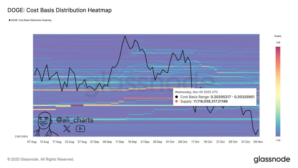 Prominent analyst Ali Martinez pointed out something important this week: around 11.12 billion DOGE were bought near the $0.20 zone. That’s a massive cluster of holders sitting at breakeven, and it’s showing up clearly on the Glassnode cost basis heatmap.