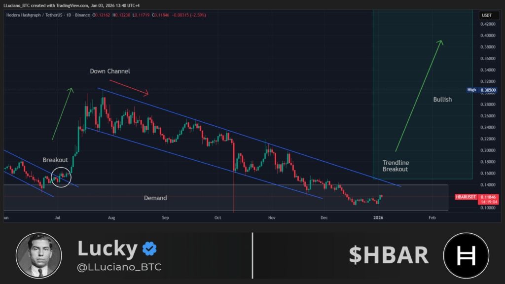 Lucky’s chart points to a potential break above the upper trendline of that channel. If the price can get through that area and stay there, it would mark the first real structural shift HBAR has seen in months. That’s usually how longer corrections start to unwind.