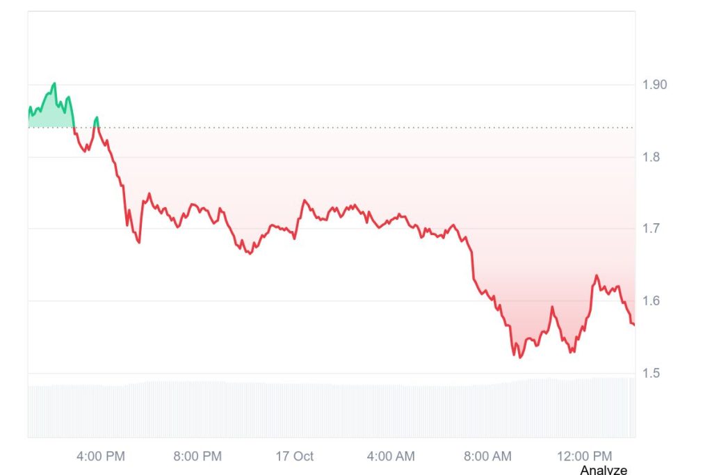 The Mantle chart doesn’t help either. MNT price has broken below its $1.76 pivot, which was acting as a key short-term support. It’s now trading under all major moving averages, including the 7-day SMA at $1.89.