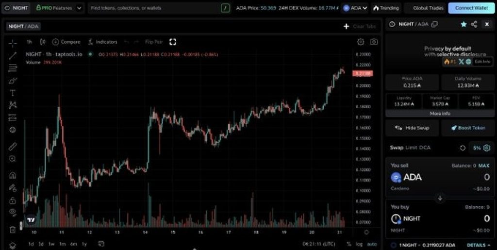 TapTools’ observation that NIGHT is “entering price discovery” reflects this structure. With no recent resistance levels overhead, price movement is now guided primarily by momentum and order flow rather than historical supply zones.
