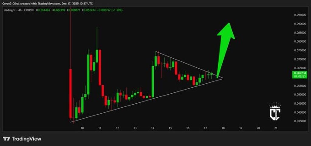 From a technical perspective, the NIGHT price is moving into a decisive zone. According to analyst Crypto Coral, the token is actively searching for a floor. The daily chart shows price tightening inside a symmetrical triangle, with higher lows forming against descending resistance.