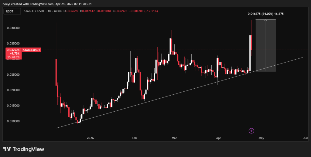 A closer look at STABLE price action shows that the rally did not start randomly. Price rebounded from a well-respected ascending trendline that has held since February. That trendline has now been tested three times, and each touch has produced a reaction.