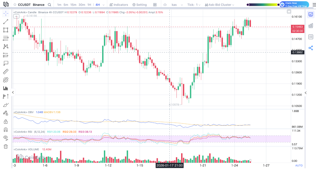 On the 4-hour chart, CC is sitting comfortably above all its key short-term averages, including the 7-day simple moving average around $0.1375. That kind of setup usually tells you that buyers have control of the short-term trend.