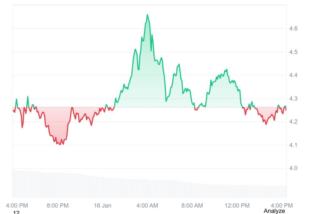 On the downside, the $3.50–$3.60 area is the first line to watch. Losing it would indicate momentum is fading and could open the door to a deeper consolidation toward $3.00.
