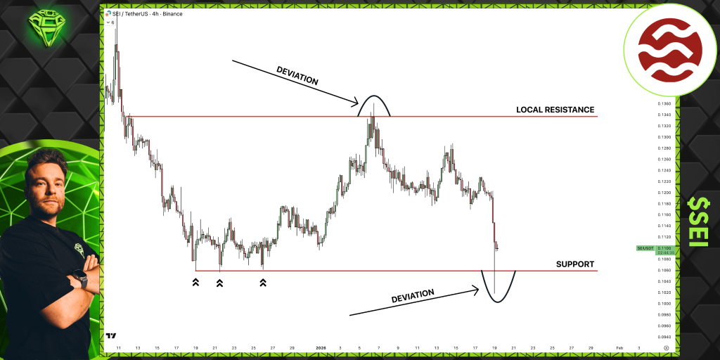 Right now, SEI isn’t showing a clean trend in either direction. It’s showing a battle inside a range, and the market just ran a liquidity sweep at the lows. As long as the SEI price stays above support after that move, the setup leans toward another push back into the upper part of the range.