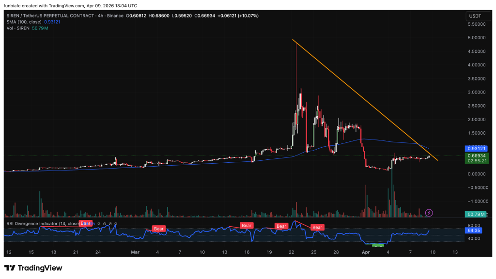 We had a look at the 4-hour chart and it shows the SIREN price currently trading at $0.669, still well below the 100-period SMA at $0.931. That moving average has been acting as a ceiling for weeks. Every time the price gets close, it gets rejected.