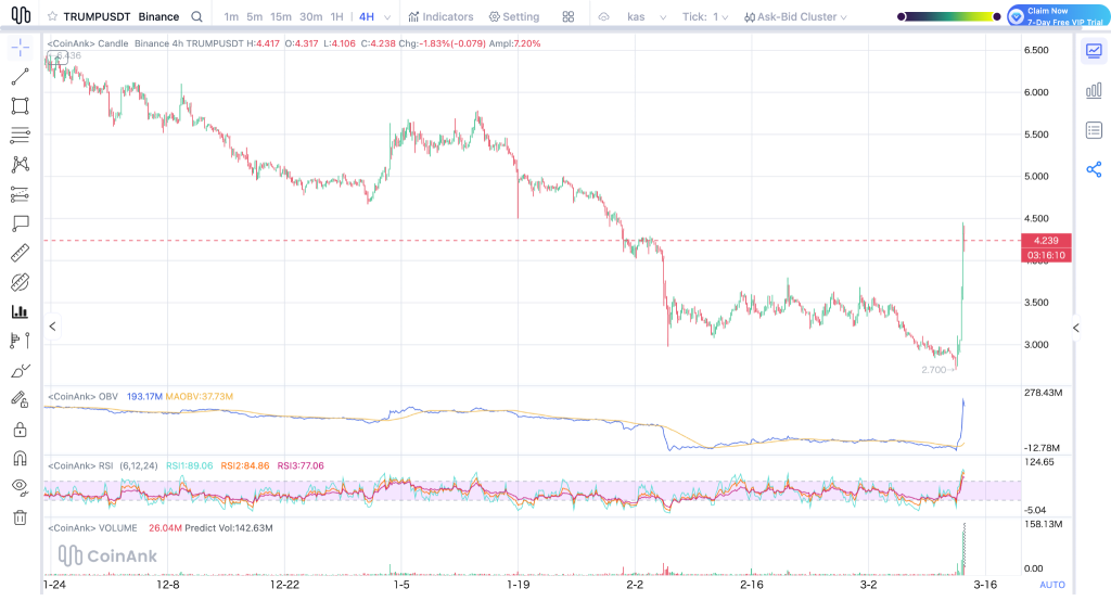 Looking at the 4-hour chart, the move becomes even more impressive. The TRUMP price had been consolidating in a range between approximately $3.50 and $4.00 for several weeks, building a base after the initial launch volatility settled. That consolidation phase created a spring-like setup, with each dip finding buyers and each rally facing sellers.
