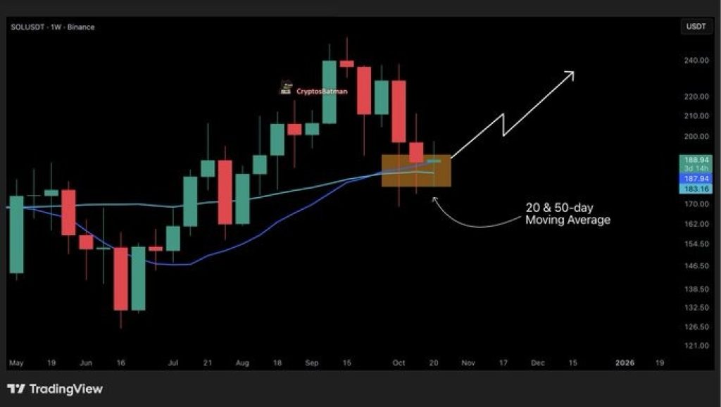 At the same time, Crypto Batman highlighted something that adds even more confidence to this setup: on the weekly chart, Solana price is sitting exactly at the 20-day and 50-day moving average confluence.