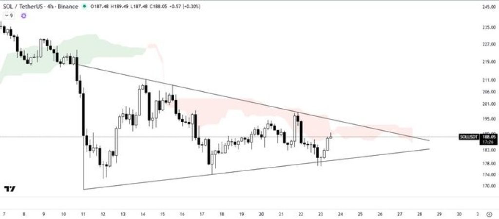 Solana looks like it’s gearing up for something big. After a choppy few weeks, the SOL price is back near $188, sitting right inside a tightening symmetrical triangle pattern.