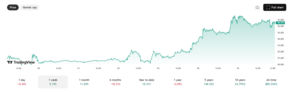 Bitcoin rose about 6% this week and is now trading near $96,570, still below the $100,000 mark. (Source: TradingView)