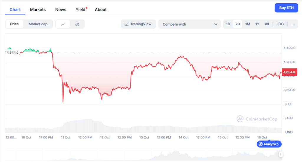 Despite the attempts of the bulls to regain their positions, the Ethereum price remains in the red zone. CoinMarketCap shows that the price of ETH has fallen by 12.4% over the last week. The altcoin has reclaimed the $4,100 level to start an uptrend.