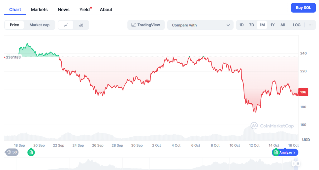 According to CoinMarketCap data, the Solana price chart is currently bearish and has dipped below $200. The price of Solana has fallen by 14% on the weekly timeframe and 16.3% on the monthly chart.