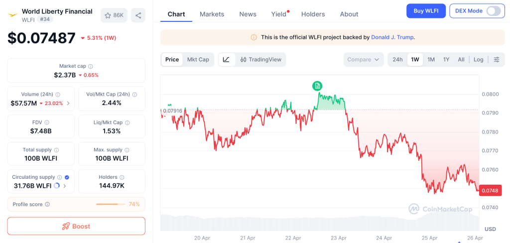 WLFI trades at $0.07487 on April 25 after the lawsuit pushed the token 3% lower into fresh all-time lows per CoinMarketCap. The project trades 84% under the September peak and roughly 12% under the level reported a week earlier.