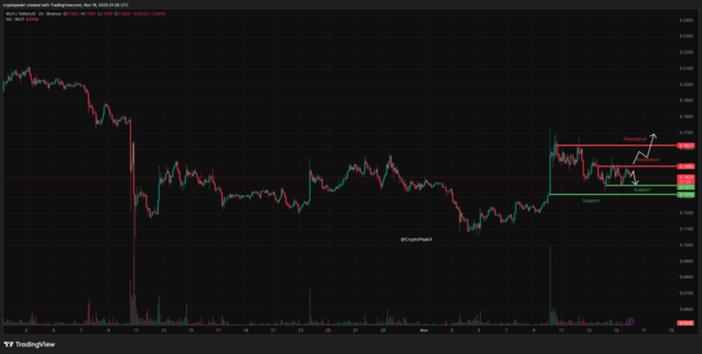 The next major move depends entirely on how the World Liberty Financial price behaves at the top of the range. A clean break above $0.1490 may open up the door towards an advance to $0.17, and probably $0.19, if the breakout is accompanied by fresh liquidity.