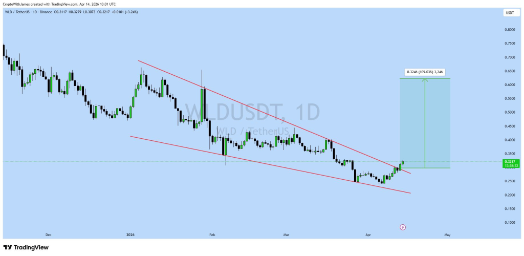 ATradeSniper explains that WLD has already completed the breakout on the daily timeframe, which increases the chances of continuation if buyers maintain control. The projection toward $0.60 comes from measuring the height of the falling wedge and extending that range upward from the breakout point.