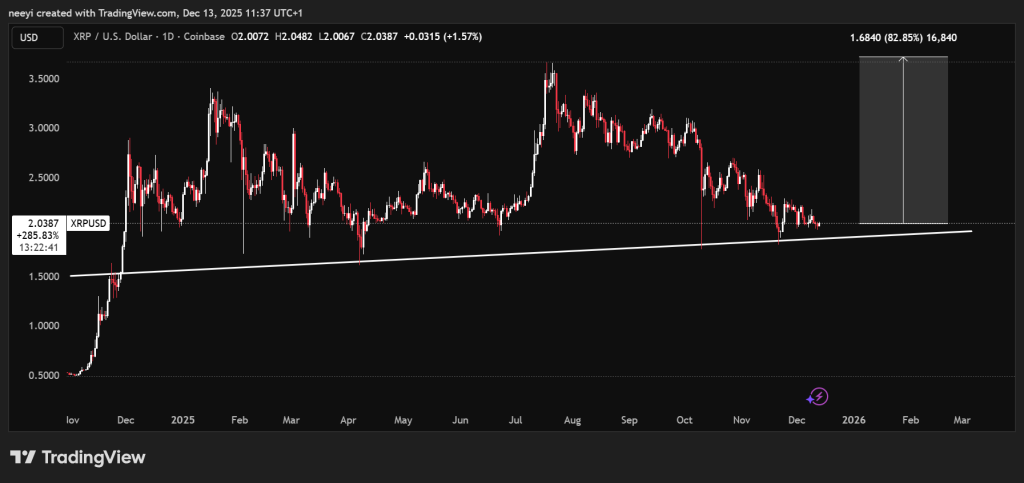 Ripple price has been trending lower since July, when XRP reached highs near $3.6. That decline has not turned chaotic. Price action has gradually compressed instead of breaking down, and XRP has repeatedly defended the $2 zone. That level has become less of a number and more of a reference point for where buyers and sellers are meeting.