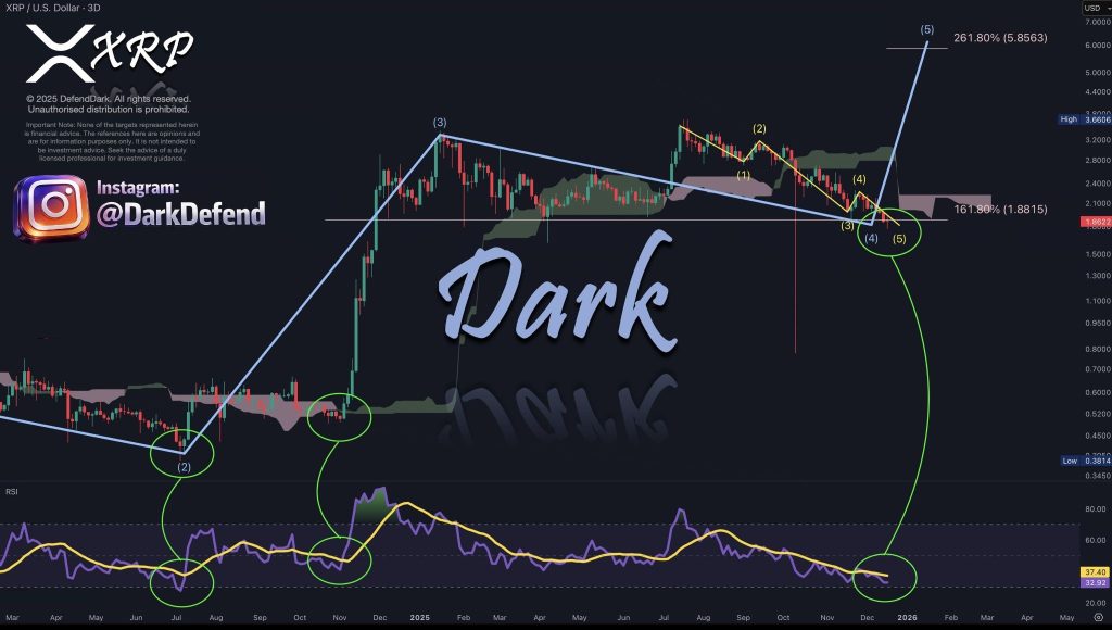 According to analyst Dark Defender, the 3-day RSI is now flashing what has historically been a bottoming signal for XRP. The price itself hasn’t surged higher yet, but the momentum picture under the hood is starting to shift.