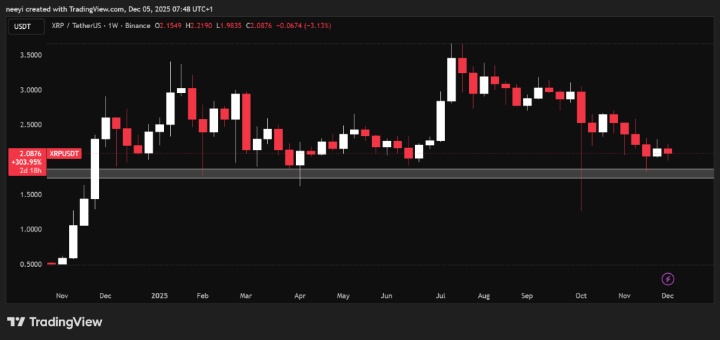 Now, XRP has once again settled inside that same region. The latest weekly candle shows price stabilizing near $2. Buyers have defended this zone repeatedly over the past year. The token also remains well above the temporary capitulation wick from early October, which turned out to be panic rather than a structural breakdown.