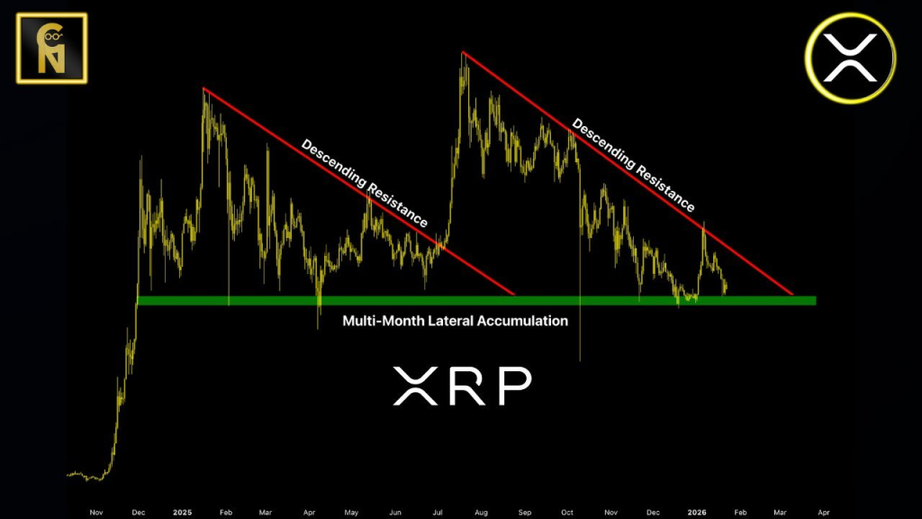XRP price currently trades near $1.91 after another failed recovery attempt earlier in January 2026. Chart Nerd argues that price action remains trapped until that trendline gives way. Sideways movement and short term volatility mean little without a decisive close above resistance.