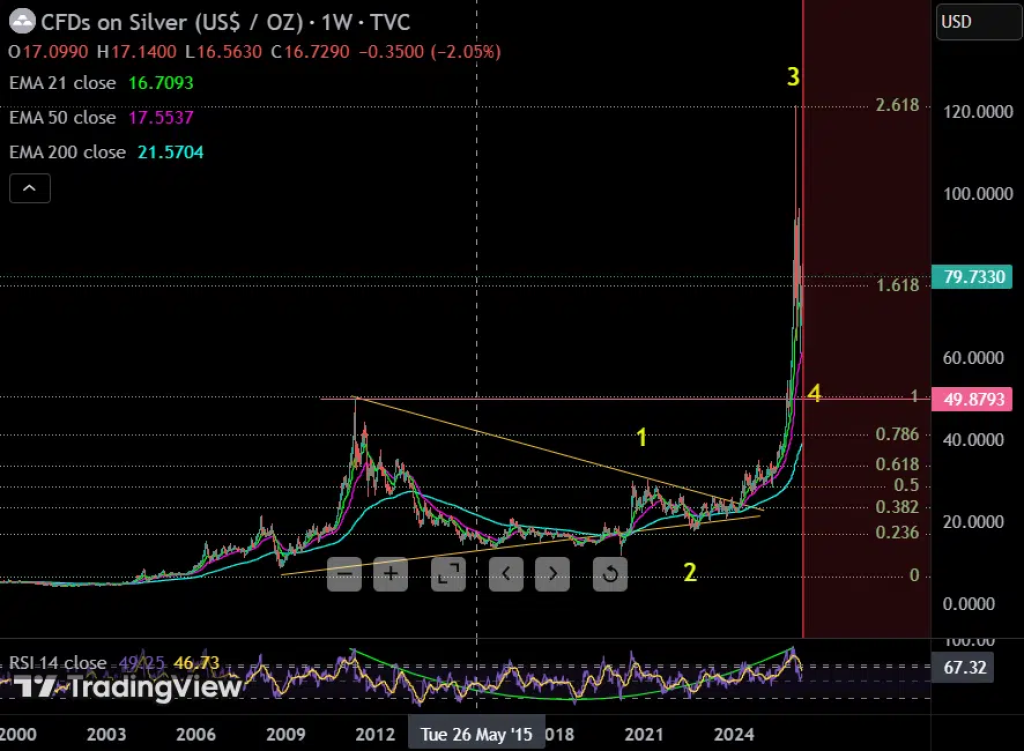 We had a look at the silver weekly chart shared by TheCryptoBasic. The pattern is clear. Silver spent years inside a large symmetrical triangle, coiling and compressing. When it finally broke out, the move was explosive.