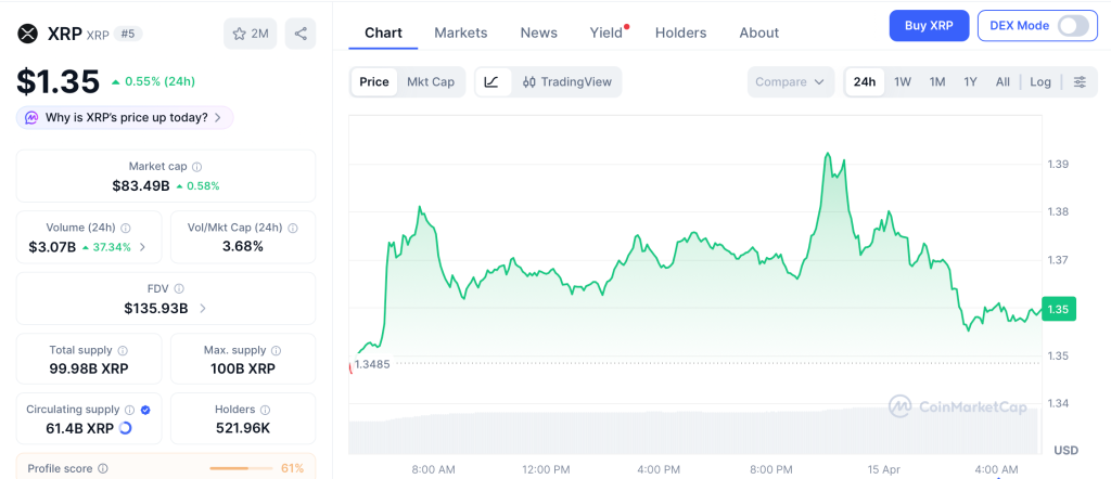 Ripple (XRP) trades at $1.35 per CoinMarketCap, up 0.55% in the last 24 hours after bouncing off the $1.28 support that held through every selloff since February.