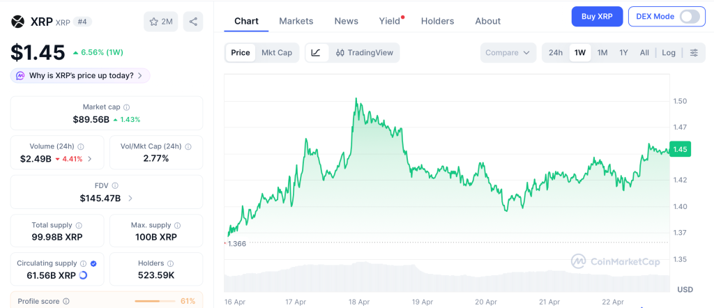 XRP (Ripple) sits near $1.45 on April 22 per CoinMarketCap, up 6.56% on the week. Persistent ETF demand pairs with tightening float, exchange balances now 16.28% lighter since February, to add real accumulation mechanics to the token.
