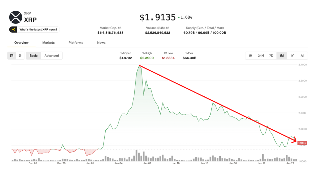As of Jan. 23, the biggest question is whether XRP can sustain the $1.80 long-term support that it has kept for more than a year, since its astonishing spike in 2024.