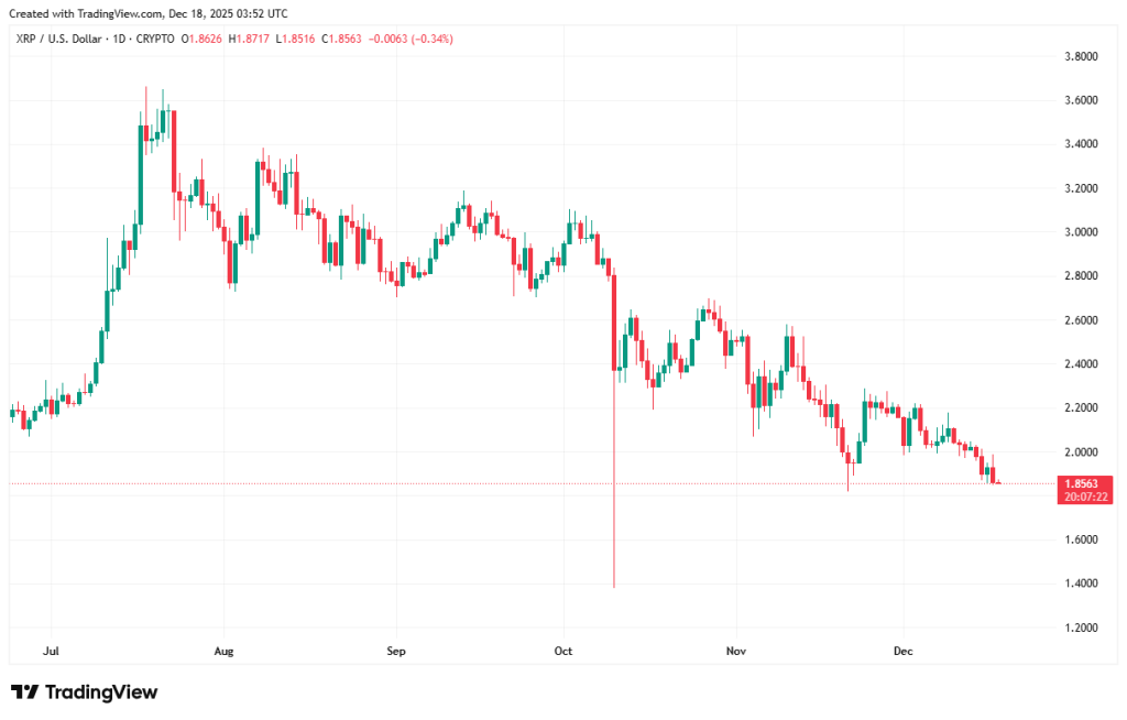 However, the current price tells a different story. XRP is trading with “bearish” sentiment and an “extreme fear” index rating. The token has recorded only 13 green days since December 18, struggling to break above its 50-day SMA of $2.22.