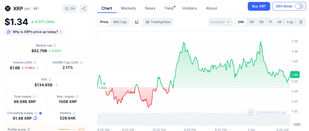 XRP trades near $1.34 according to CoinMarketCap, down roughly 63% from its all time high of $3.65. The xrp price prediction for April shows resistance at $1.45 with a breakout targeting $1.65.