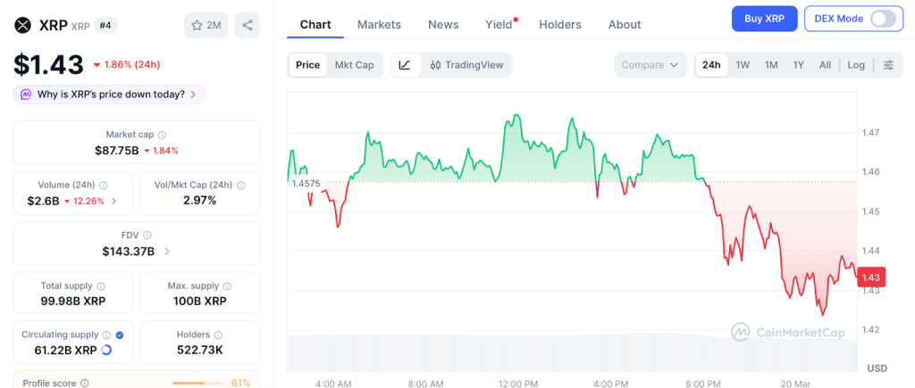 XRP trades at $1.43 on March 20, down roughly 20% since January according to CoinMarketCap. The xrp price prediction is positive, but institutional rollouts do not pump tokens overnight.