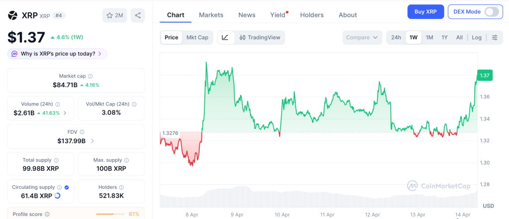 Ripple (XRP) sits at $1.37 according to CoinMarketCap after the Islamabad peace talks collapsed on April 12. Breaking $1.50 would confirm the first higher high since January and set up a push at $2.50.