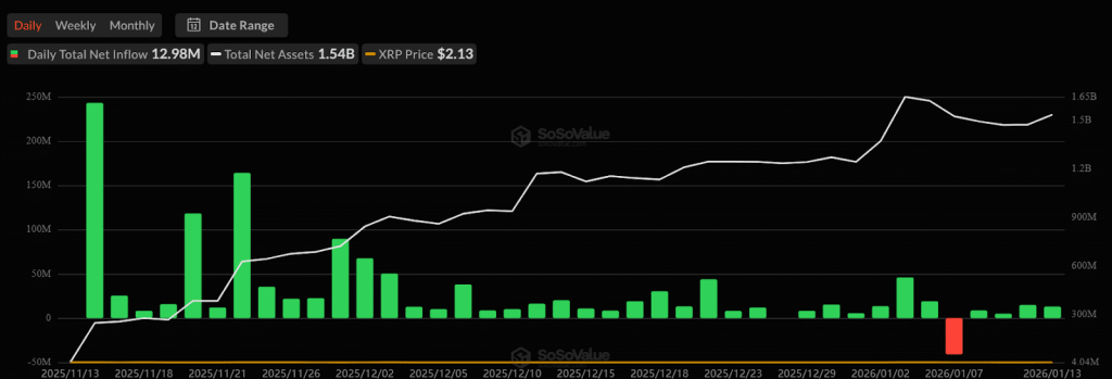 On January 14, XRP was priced at around $2.17 after rising 4% in a single day, and gaining about 19% since the start of 2026. This movement follows inflows into XRP-linked exchange-traded products.