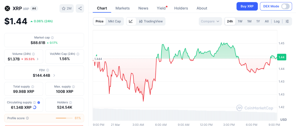 XRP trades at $1.44 on March 21 according to CoinMarketCap, up 5.8% in seven days and outperforming most large caps. Analyst Ali Martinez identified a critical breakout zone that could push XRP to $4, roughly a 2.7x.