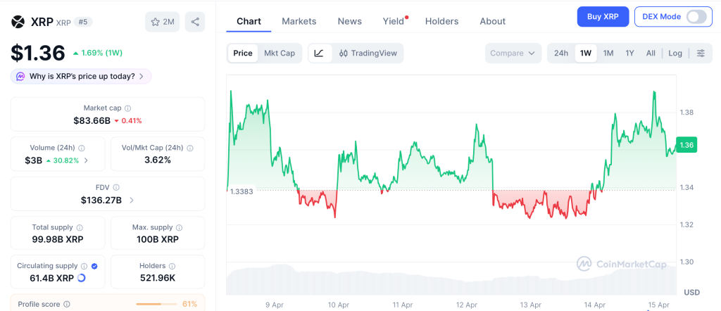 XRP trades at $1.36 as of April 15, up 1.69% in one week after bouncing from the $1.28 zone on ceasefire news.