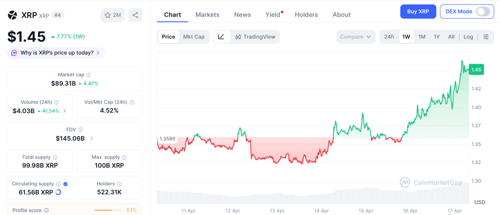 XRP (Ripple) Price at $1.45 With Institutional Wins Stacking but Upside Stays Capped