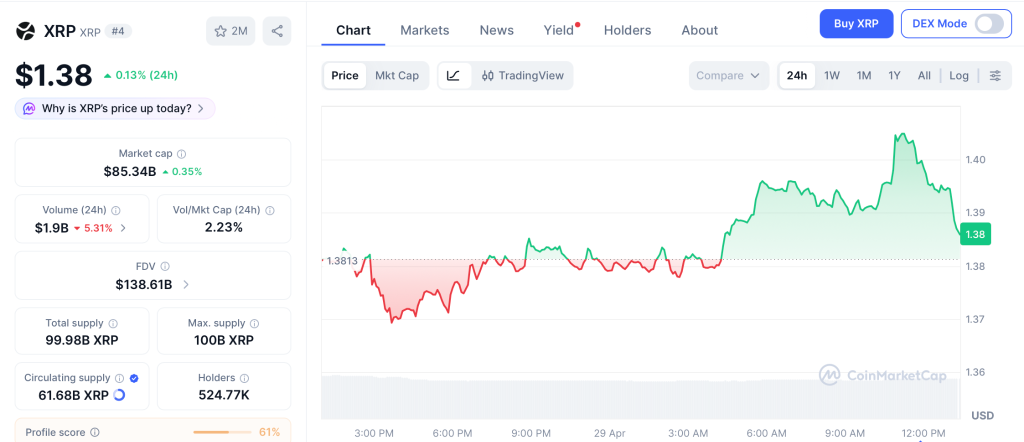 CoinMarketCap shows XRP holding at $1.38 inside a tight $1.35 to $1.44 band that has defined April trading. The xrp price prediction turns bullish once a May vote clears the $1.46 supply wall, and the bill that Lummis promised is exactly what large buyers need to push through that level.