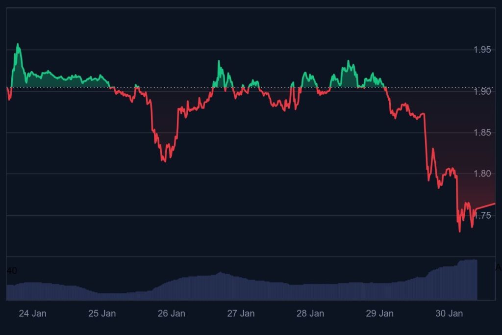 The XRP price prediction has been quite uncertain, with the token struggling to hold early gains in the final week of January 2026. The XRP price dropped from $1.90 on January 24 to roughly $1.75 by January 30 as selling pressure intensified across the crypto market. This 8% drop over the week mirrors broader risk-off sentiment driven by weakness in Bitcoin, with technical levels failing to hold.