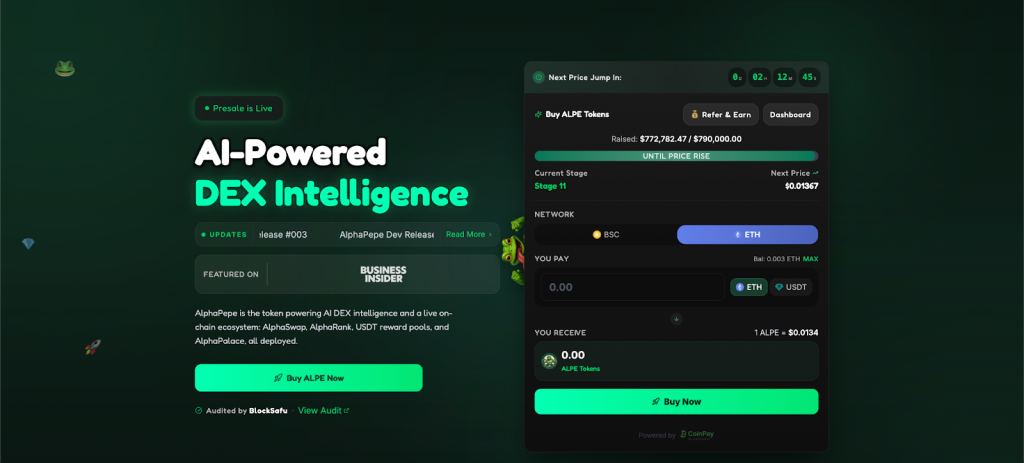 AlphaPepe is at $0.01367 in Stage 11 with over $770,000 raised from 7,300 holders and 100 new wallets entering daily. Stage 10 is sold out and Stage 11 is approaching its own sell out as the same April catalyst density that is driving XRP’s CLARITY Act conversation is driving presale capital toward the entry that does not require any Senate vote to activate its return. AlphaSwap is live as a cross-chain AI-powered DEX generating real trading fee revenue. Developer is a former Shibarium team member. A 10/10 BlockSAFU audit completed before public capital entered. Tokens arrive instantly with no vesting. Holders staking earn 85% APR from day one.