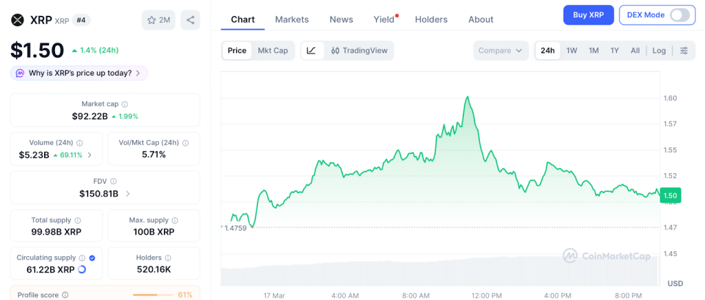XRP holds $1.50 according to CoinMarketCap. The xrp price prediction targets $1.61 on a clean break above the 20 day EMA. Holding $1.39 keeps the bullish structure. If bears take over and XRP drops below $1.27, channel support is the target.