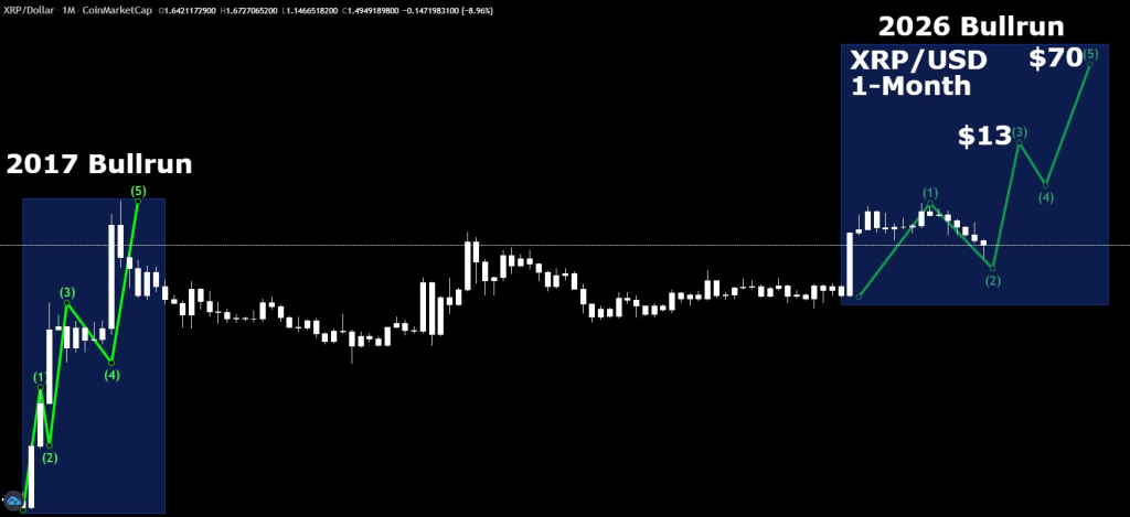 CryptoBull compares the current XRP monthly chart to the structure seen during the 2017 bullrun. The earlier cycle shows a clear five-wave advance that began with a sharp impulse, followed by controlled pullbacks, and ended with a powerful final rally.