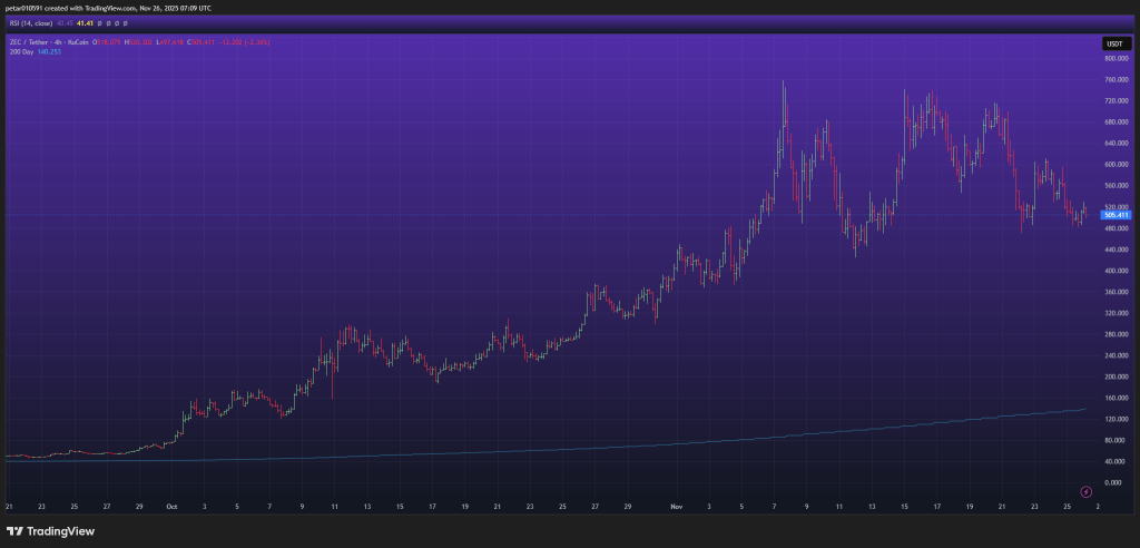 The ZEC price is currently trading around the mid-$500 zone on the 4H chart, following a sharp pullback from the earlier spike toward $780. The broader structure over the past few weeks has been a series of lower highs but also higher lows in the short term, forming a tightening structure that indicates a decision point is approaching.