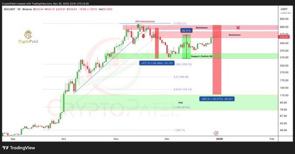 The recent bounce fits cleanly inside a larger corrective structure. The ZEC price rallied straight into a heavy resistance zone between $550 and $600, an area that has already rejected price multiple times.