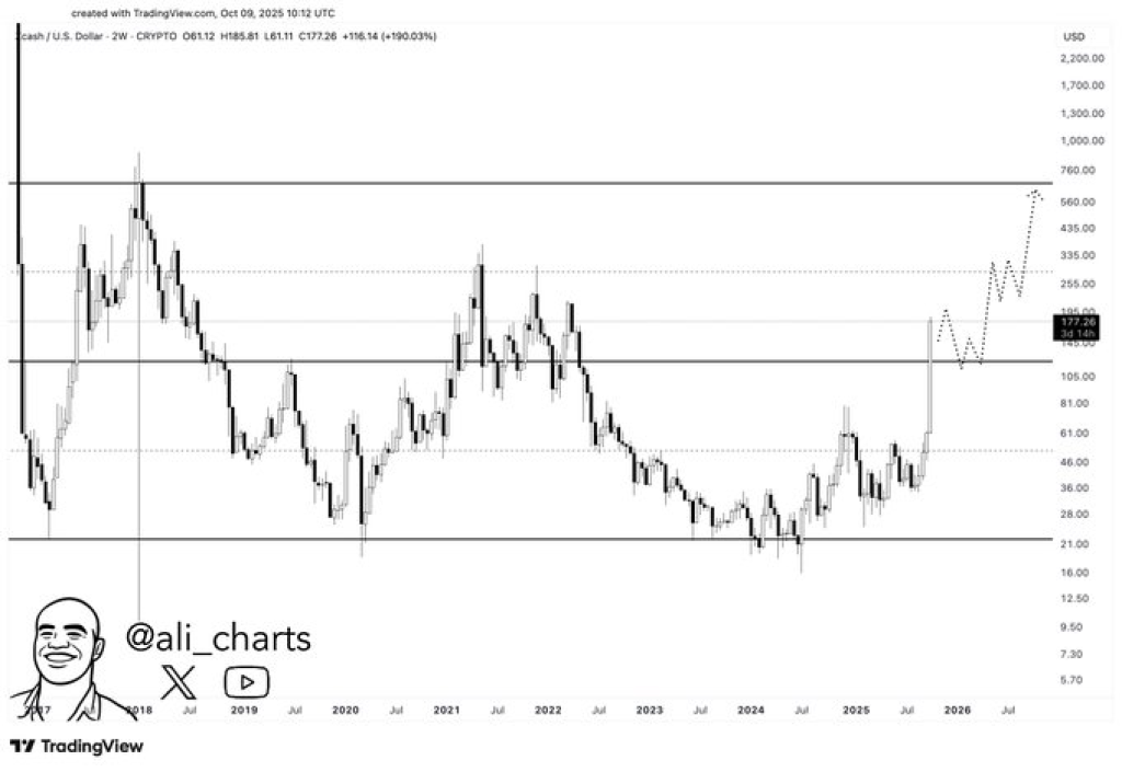 According to Ali, another well-known analyst, Zcash still has room to run. His chart shows two major resistance levels ahead, first near $290, and then a much larger target around $650.