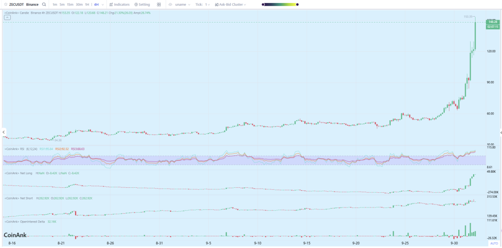 The 4-hour chart from Binance shows a parabolic rally beginning late September, with ZEC climbing from around $60 to over $150 in just a matter of days. The breakout accelerated once price cleared the $90–100 range, where liquidity had previously capped rallies.