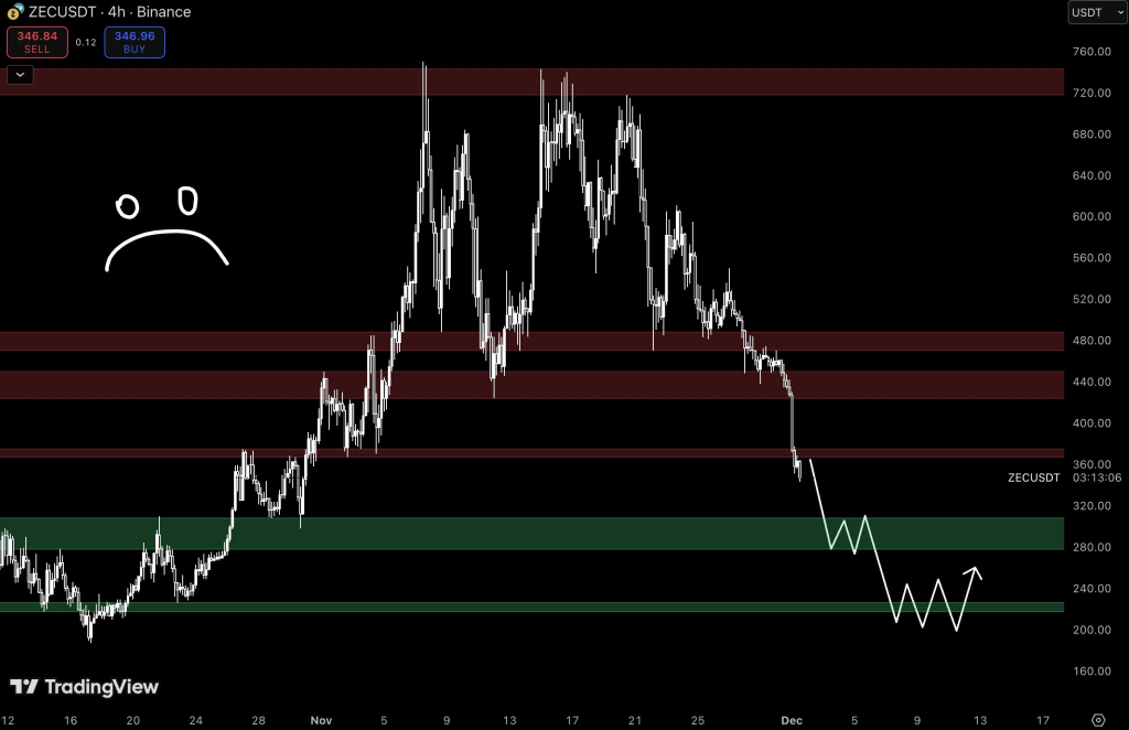 Looking at Spermix’s chart, it’s clear that $ZEC is breaking below key support levels. From the current price around $340, there is a chance the drop could take the price as low as $200. That $200 mark could become the next major support, a level where buyers might finally step in.