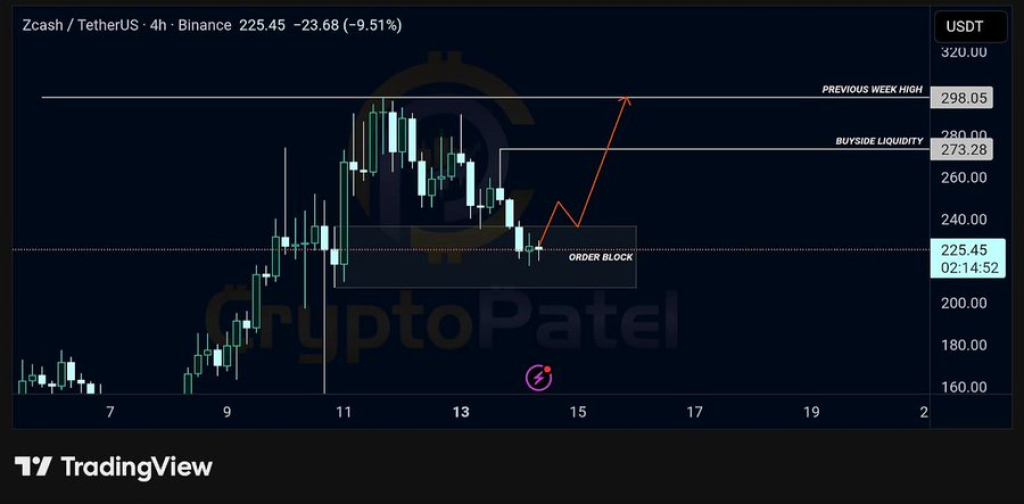 Crypto Patel’s chart shows $ZEC trading around $225, right within an identified Order Block. This area has been acting as a launch pad where buyers previously stepped in, driving price higher. Patel mentioned that $233 marks the key entry zone while $204 serves as the level to watch for invalidation.