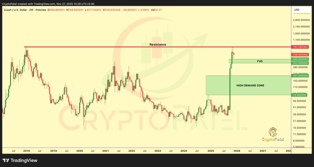 Below the FVG sits a wide, high-demand zone stretching from roughly $191 to $74. The market spent years consolidating inside that region. Many analysts, including Crypto Patel, treat this zone as the area where long-term players usually reaccumulate during deep corrections. The distance from the recent $700 to this demand block is steep, yet ZEC has travelled that road before.